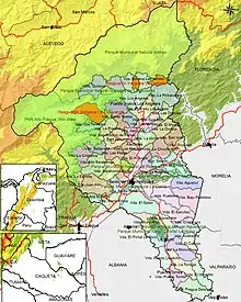 La cobertura vegetal 70.000 hectáreas se encuentran en bosque natural equivalente al 59% del territorio municipal, de estas 17.693 ha, tienen figura de parque nacional natural, 28.767 ha con figuras de Parque Municipal Natural y 23.540 ha se encuentran representadas en relictos de predios privados con y sin escriturta pública. En cuanto a nuestra intervención antropica de las 118.855 ha hemos ocupado 48.855 ha, que equivalen al 41% con explotaciones agropecuarias, vías y urbanismo.