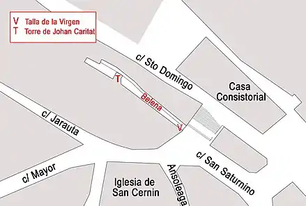 En 1816 se demolió el portal de Portalapea que, tal como refleja un plano de 1763, conservado en el Archivo General de Navarra,[6] se embocaba con la calle Mayor, cerca de la confluencia de la calle Pellejarías (actual Jarauta) y Tecenderia (hoy Ansoleaga). En una hornacina situada en su muros se encontraba una talla de la Virgen con el Niño, llamada de los Presos, una escultura con rasgos del arte flamenco, y se desplazo a la fachada de la casa nº 14 de la calle San Saturnino;[7] tras la restauración que se realizó en 2010, de los restos de la muralla existentes, la imagen de la Virgen se colocó sobre una ménsula al inicio de la belena.