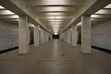 Diseñada por V. Polikarpova, V. Klokov y L. Popov, la estación se construyó con una variación de los tres pasillos con columnas que presenta columnas de mármol blanco y paredes de azulejos decorados con paneles en los que aparecen diferentes cuentos rusos, obra de los artistas J. Bodniek y Kh. Rysin. El suelo es de granito gris.[1]