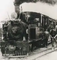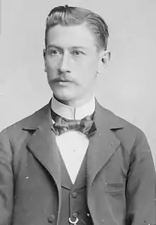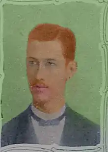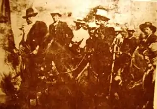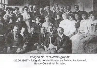 En primera fila, Archer Harman y Eloy Alfaro; segunda fila: Alfredo Monge, Crnel. Belisario Torres, Dr. César Borja Lavayen, Gral. Francisco Hipólito Moncayo, William Fox y Amalio Puga.
