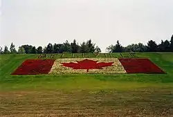 Colchón de flores cercano a la autopista 401, próxima a Belleville (Ontario) mostrando la bandera de Canadá.