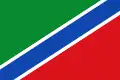 - Bandera: rectangular, de proporciones 2:3, formada por una franja diagonal del ángulo inferior del asta al superior del batiente, de color azul fileteado de blanco, siendo verde el triángulo del asta y rojo del batiente.