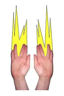 El Kohanim levanta sus manos, con las palmas hacia abajo y los pulgares de sus manos extendidas tocándose. Los cuatro dedos de cada mano generalmente se dividen en dos juegos de dos dedos cada uno (formando así la letra Shin (שׁ), un emblema para Shaddai, "Todopoderoso Dios"), o algunas veces están dispuestos para formar una red superpuesta de “ventanas”. Esta ceremonia judía a veces se llama Nesiat Kapayim, el "levantamiento de las manos". La tradición judía establece que la Presencia Divina (Shekkina) brillaría a través de los dedos de los sacerdotes al bendecir a la gente, y a nadie se le permitió mirar esto por respeto a Dios.[25]