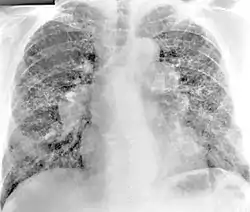 Los hallazgos de la radiografía de tórax de beriliosis son inespecíficos. En las primeras etapas de la enfermedad, los hallazgos radiográficos suelen ser normales. En estadios posteriores se ha informado fibrosis intersticial, irregularidades pleurales, linfadenopatía hiliar y opacidades en vidrio deslustrado . Los hallazgos de la TC tampoco son específicos de la beriliosis. Los hallazgos que son comunes en las tomografías computarizadas de personas con beriliosis incluyen nódulos parenquimatosos en etapas tempranas. Un estudio encontró que las opacidades en vidrio esmerilado se observaron con más frecuencia en la tomografía computarizada en la beriliosis que en la sarcoidosis. En estadios posteriores, linfadenopatía hiliar, fibrosis pulmonar intersticial y engrosamiento pleural.