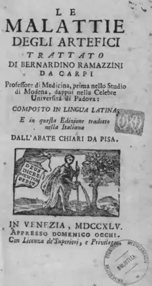 - «Bernardini Ramazzini (1633-1714) physician of the tradesmen». Journal of the American Medical Association JAMA 210 (13): 2391-2. diciembre de 1969. PMID 4902526. doi:10.1001/jama.210.13.2391.