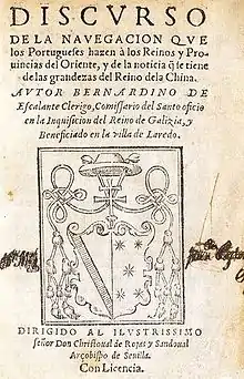 - Escalante, Bernardino de (1992), Discurso de la navegación que los portugueses hazen a los reinos y provincias del oriente, y de la noticia que se tiene del reino de China, Ed. Universidad de Cantabria, ISBN 84-87412-59-9. (Reimpresión reciente)
