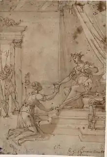 Un dibujo a lápiz negro, tinta, pluma y aguada pardas, en el que aparece representada Psique ante Proserpina, con la inscripción «De Bernardino de/el Agua/ 601», se conserva en la Biblioteca Nacional de España y se ha puesto en relación con los desaparecidos frescos de la antecámara del Salón del Rey en el Palacio de El Pardo, ejecutados entre 1607 y 1609 por los italianos Alejandro y Julio César Semín.[5]