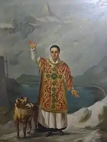 ![]() San Bernardo de Menthon y un perro pintura sobre tabla que data de 1832 aprox. en el interior de la iglesia del monasterio del Gran San Bernardo. | |||
