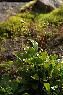 Hierbas perennes, alcanza un tamaño de 10-25 cm de altura. Rizomas casi erectos, de color marrón o grisáceo, de 3-4 mm de diámetro. Las hojas basales; con pecíolo; hojas obovadas-espatuladas de 3-10 x 1,7-4 cm, coriáceas, glabras, de color verde, envés pálido o grisáceo, adaxialmente verde profundo, brillante, y por lo general la base se reduciéndose gradualmente y atenuadaq en el pecíolo, margen entero, ápice obtuso y con una apicula; venas laterales 2 -4 a cada lado del nervio central, adaxialmente discreta u obviamente impresionada. Inflorescencias con 5-12 de flores; pedúnculo alargado después de la floración a veces hasta de 23 cm. Pedicelo 3-11 mm. Sépalos de color rojizo, ampliamente elípticos a ovados, de 4-5 mm, margen entero. Corola acampanada, 0,9-1 cm, de color blanco o rosado; lóbulos oblongos a liguladas, margen entero. Subglobosos ovario. Cápsula globosa, cubierta por los sépalos persistentes. Fl. abril-junio, fr. agosto-septiembre.[1]