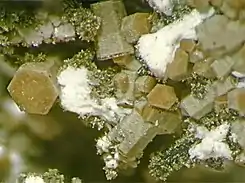 Suele encontrarse asociado a otros minerales como: glauconita, clorita-vermiculita interestratificadas con mica-smectita, siderita o calcita.