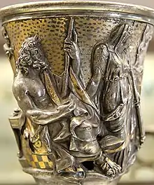 Vasija de plata procedente del Tesoro de Berthouville (mediados del siglo I a. C.) que representa a un dios, Zeus o Poseidón, con una diosa. Está dedicado a Mercurio por Quintus Domitius Tutus, probablemente un ciudadano romano.