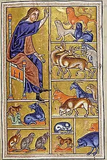 - Folio 2 verso: Creación de la animales (Génesis, 1: 24-25).