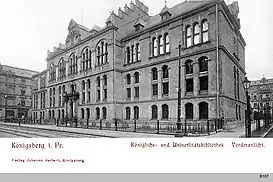 La Biblioteca Estatal y Universitaria de Königsberg (en alemán, Staats- und Universitätsbibliothek Königsberg) fue una biblioteca estatal y académica ubicada en Königsberg, Prusia Oriental, Alemania. Una de las bibliotecas más prestigiosas del Sprachraum del este de Alemania, comparable solo a la Biblioteca Universitaria de Breslau, en Breslau en Silesia en el sureste de Alemania (ahora renombrado como Breslavia en el suroeste de Polonia desde la Segunda Guerra Mundial). [1] La Universidad de Königsberg se desarrolló desde el siglo XVI a partir de varias bibliotecas más pequeñas. Fue destruido en 1944 durante la Segunda Guerra Mundial en la invasión de la Unión Soviética, después de lo cual la ciudad fue ocupada y pasó a llamarse Kaliningrado.