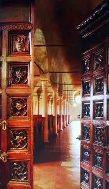 La puerta, en madera oscura, es obra de Cristoforo da San Giovanni in Persiceto y en ella aparece inscrita la fecha del 15 de agosto de 1454, día solemne y festivo de la ciudad, dado que se celebraba en aquellos días una importante “feria de agosto”.