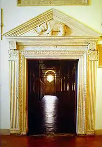 A los lados del dintel y sobre los capiteles de las pilastras aparecen representados los símbolos heráldicos de la familia: la rejilla, las tres cabezas y el tablero cuadriculado.[13]