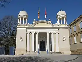 Es un edificio aislado. La fachada principal presenta tres cuerpos, uno central y dos laterales simétricos, encima de ellos se elevan dos templetes de base circular con ocho columnas jónicas que sostienen una cubierta semiesférica. El cuerpo central está formado por dos columnas y cuatro pilastras jónicas, y da acceso al vestíbulo de entrada. La culminación la forma un frontón coronado por tímpano de línea sinuosa. Está construido con ladrillo revestido. Está pintado de gris y blanco;)