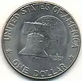 - Reverso de la moneda de un dólar conmemorativa del Bicentenario, fechada 1776-1976.