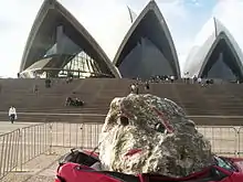 Bienal de Sídney 2004 - Bodegón con roca y coche, de Jimmie Durham, ante la Ópera de Sídney.