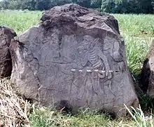 Monumento 19 representa a tres figuras, la mayor de las cuales lleva un tocado elaborado con una plima Xiuhcoatl ("turquesa/serpiente de fuego"). parece estar ofreciendo ayuda a una persona menos afortunada.[35]
