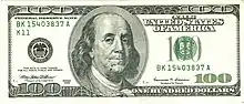 El billete de cien dólares estadounidenses ($100) es la mayor denominación actual del dólar estadounidense. En el anverso aparece el retrato de Benjamin Franklin, político, científico e inventor estadounidense, y en el reverso se observa una imagen del Independence Hall. Este es el billete de mayor valor en circulación en los Estados Unidos desde 1969, año en que se retiraron los billetes de $500, $1000, $5000 y $100 000.[1] Los billetes con este valor también se conocen, en inglés coloquial, como Benjamins o Bens (diminutivo de "Benjamin", en ese idioma), o como C-Notes ("billetes C"), por el numeral romano equivalente a 100.