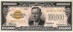 El billete de cien mil dólares fue creado en 1934 por los Estados Unidos de América, para uso exclusivo de los bancos del país, así como para su Reserva federal. Se crearon unos Diez Millones,[1] de los cuales, en el 2009, unos veinticinco mil estaban bajo el poder de la Reserva. El billete lleva impresa la imagen de Woodrow Wilson y solo se utilizó para transacciones internas entre los Bancos de Reserva Federal.