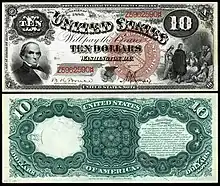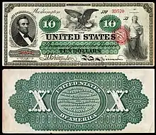 - 1862: La primera $ 10 Estados Unidos Nota se emitió con un diseño de la cara similar a la 1861 Demanda Nota; a la inversa, sin embargo, fue algo revisada.