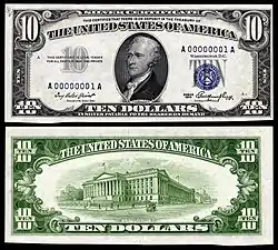 - 1929: En la serie de 1928, toda moneda estadounidense se cambió a su tamaño actual. Todas las variaciones de la factura 10 dólares llevarían el mismo retrato de Alexander Hamilton, el mismo diseño de la frontera en el anverso y reverso de la misma con una viñeta del edificio del Tesoro estadounidense. El billete de $ 10 fue emitida como una Nota de la Reserva Federal con un sello verde y números de serie y, como un certificado de oro con un sello de oro y números de serie. El coche estacionado fuera del edificio del Departamento del Tesoro se basa en una serie de diferentes coches fabricados en la época y fue la creación de la diseñadora Oficina que desarrolló la obra que sirvió de modelo para el grabado, porque las agencias gubernamentales tenían prohibido aprobar cualquier fabricante específico o producto, de acuerdo a una Oficina de Grabado e impresión folleto. El pequeño edificio en la parte trasera derecha del edificio del Tesoro es el American Security and Trust Company Building, que desde hace algunos años se anunciaba como "justo en el dinero ".
