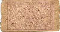 chos srid gnyis ldan gyi rab byung bco lnga bai shog dngul1658 años desde la fundación de la secular forma religiosa de gobierno en el gran país del Tíbet, la tierra de las nieves, el papel moneda del 15.º ciclo (rab byung) del gobierno de la religión y la política (chos srid gnyis ldan), la joya universal de beneficio y bendición, dotada de las cuatro clases de auspicios.Traducción propuesta por el personal del Tibetan Works and Archives de Dharamsala.