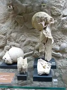 En 1974 una pieza de un cráneo humano fue identificada entre los descubrimientos. Hasta la actualidad, se han encontrado 37 huesos humanos y los dientes, principalmente partes del cráneo. Representan los restos de al menos tres individuos y han sido clasificados como Homo erectus bilzingslebenensis por Emanuel Vlcek (Praha). Los restos de los cráneos muestran que han sido intencionadamente rotos post mortem, quizás como parte de un rito funerario.