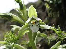 Presentan pseudotallo herbáceo, con pocas flores o una flor apical, con sépalos y pétalos muy diferentes, los sépalos laterales son estrechos y se extienden hasta el extremo que termina en una especie de franja que se asemeja a una pluma.