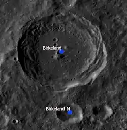 Birkeland es un cráter de impacto que se encuentra en el hemisferio sur de la cara oculta de la Luna. Este cráter se une a la cintura central de la formación del cráter Van de Graaff de fisonomía extraña, y en parte puede explicar la forma similar a la de un número "8". Al sureste está la gran llanura amurallada del cráter Leibnitz.