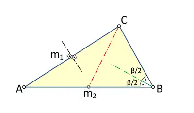 - La "bisectriz de un ángulo" (la línea que pasa a través del vértice de un ángulo y que lo divide en dos partes iguales)
