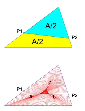 Hay una infinitud de líneas que bisecan el área de un triángulo. Tres de ellas son las medianas del triángulo (que conectan los puntos medios de los lados con los vértices opuestos), que son concurrentes en el centroide del triángulo; de hecho, son los únicos bisectores del área que pasan por el baricentro. Otros tres bisectores del área de un triángulo son rectas paralelas a sus lados; cada una de ellas interseca a los otros dos lados para dividirlos en segmentos con las proporciones .[11] Estas seis líneas son concurrentes de tres en tres: además de las tres medianas que son concurrentes, cualquier mediana es concurrente con dos de las líneas bisectoras del área paralelas a los lados del triángulo.