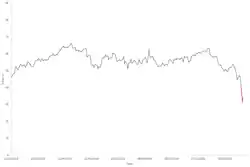 ![]() Movimiento del precio del WTI a partir de 2019, con los cambios del lunes negro resaltados en rojo. | ||