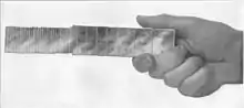 Un bloque patrón es un bloque de metal o cerámica con dos caras opuestas exactamente planas y paralelas, separadas por una distancia muy precisa. Los bloques estándar son construidos con aleaciones de aceros duros, mientras que los bloques para calibración a menudo son de carburo de tungsteno o carburo de cromo porque son más duros y se desgastan menos.[2] Los bloques patrón se comercializan en sets de bloques de varias longitudes, junto con dos bloques de protección, para permitir obtener una amplia variedad de longitudes estándar al apilarlos. La longitud de cada bloque patrón es apenas más corta que la longitud nominal estampada en el mismo, porque la longitud estampada incluye la longitud de una película wring, un película muy delgada de lubricante que separa las caras de dos bloques adyacentes al apilarlos. El espesor de la película wring es de 25 nm.[3] La longitud nominal calibrada es también denominada longitud interferométrica.[4]