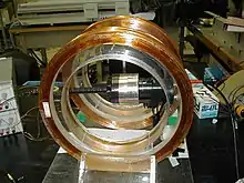 Una bobina de Helmholtz consiste en dos bobinas magnéticas circulares idénticas, que se ubican de manera simétrica a lo largo de un eje común, una a cada lado de un área experimental, y separadas por una distancia igual al radio de la bobina. Cada bobina transporta una cantidad igual de corriente eléctrica en la misma dirección.[1]