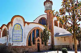 En el exterior del edificio, sobre el muro exterior de la nave de recepción, hay dos depósitos de agua. Como decoración hay varias gárgolas de cerámica esmaltadas en verde, pequeñas baldosas que decoran los depósitos y el escudo de la entidad, realizado por el ceramista Xavier Nogués con azulejos vidriados, situado en el ángulo del edificio (destruido durante la guerra y sustituido por una reproducción de menor calidad).