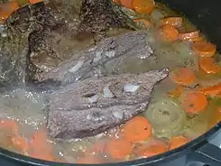 Boeuf à la mode, «carne preparada con estilo», es un platillo de carne estofada originario de la gastronomía francesa. [1] Es una forma de preparar un corte de carne de res más duro (rico en tejido conectivo y en recetas más antiguas a menudo en manteca). El plato se prepara dorando primero la carne en aceite, manteca o grasa de tocino. Algunas recetas incluyen un paso de marinado preliminar, donde la carne se marina en una combinación de vino y brandy antes de dorarse. [2]