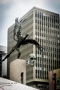 La escultura, posee una altura de 13.5 metros, sus 25 toneladas descansan sobre el pie izquierdo, articulado a una base metálica sobre un pedestal de 12.54 metros, está ubicada en el costado sur-occidental de la plaza de Bolívar.