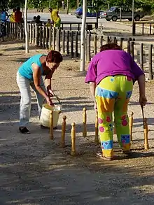 Es un juego de colaboración no solo entre los componentes de la pareja de jugadoras sino de todas las participantes. La actividad comienza ya de hecho con la preparación del terreno en el que participan todas las jugadoras.