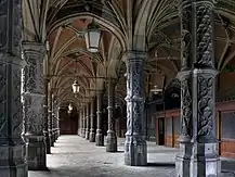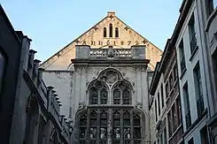 El primer edificio de estilo gótico tardío brabantino data de 1531, según un diseño de Domien de Waghemakere. Un espacio abierto rectangular estaba cerrado por una columnata cubierta con bóvedas de crucería.[4] El concepto de galería de este edificio sirvió como modelo para la Royal Exchange de Londres (diseñada por Hendrik van Paesschen), así como para Róterdam, Ámsterdam y Lille.[5] Las altas «torres pagoda» con casco octogonal y cilíndrico pueden haber servido como un mirador hacia el puerto. Cada nación tenía una representación más o menos permanente en la bolsa.[6]