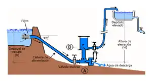 Para que funcione el ariete hidráulico se necesita un salto de agua que varíe entre 0,20 a 30 m. Cuando el salto de agua sea mayor, el ariete hidráulico va a ser más pequeño y económico y menos cantidad de agua va a requerir para elevar otra cantidad de agua.