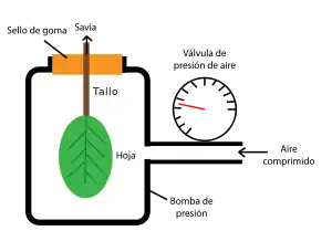 Una bomba de presión, cámara de presión o bomba Scholander es un instrumento utilizado para medir el potencial hídrico aproximado de los tejidos de una planta. Una hoja unida al tallo se coloca dentro de una cámara sellada y luego se introduce lentamente gas presurizado. A medida que la presión aumenta, llega el punto en el cual la savia sale del xilema y se visualiza en el extremo cortado del tallo. La presión requerida para lograrlo es igual y con signo opuesto al potencial hídrico de la planta.[1]Dicho potencial es negativo debido al intercambio de gases que sucede mediante los estomas, ya que trae consigo una pérdida neta de agua. La razón de que esto suceda es el bajo potencial hídrico de la atmósfera, y por ello la planta pierde agua constantemente.