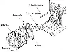 - Como se describe anteriormente, el segundo tipo de bomba de diafragma trabaja con la dislocación positiva volumétrica, pero diferencia en que lo que mueve al diafragma no es ni aceite ni aire, sino que tiene un funcionamiento electromecánico a través de una impulsión engranada del motor. Este método dobla el diafragma con una acción mecánica simple, y un lado del diafragma está abierto al aire.