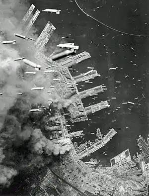 ![]() Bombas incendiarias siendo arrojadas sobre la ciudad de Kobe, 4 de junio de 1945. | ||||