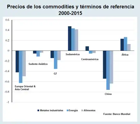 El "boom de los commodities" fue un ciclo inusualmente largo de aumento de los precios de las materias primas en el mercado mundial. En términos generales y siguiendo los estudios de los economistas argentino Raúl Prebisch y anglo-alemán Hans Singer (Tesis de Prebisch-Singer), la tendencia histórico ha sido a una disminución del precio de los commodities, frente al precio de las manufacturas, causando un fenómeno conocido como deterioro de los términos de intercambio. Sin embargo, entre el año 2000 y el año 2014, los precios de las materias primas mostraron una tendencia creciente, que les permitió recuperar varias décadas de deterioro relativo frente a las manufacturas.[4]