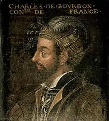 - Carlos III DE BORBÓN-MONTPENSIER [Charles III DE BOURBON] (17/02/1490 en Montpensier – 06/05/1527 en Roma), alias el "Condestable de Borbón", duque de Borbón y de Auvernia, príncipe de Dombes, conde de La Marche y de Montpensier, delfín de Auvernia, vizconde de Carlat, señor de Mercœur, de Beaujeu y de Combraille