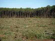 El área del bosque se estima en 10 000 km², más o menos, de los que nueve décimas partes se dedican exclusivamente al monocultivo de pino marítimo (Pinus pinaster), pero, en el centro de esta pinhada (plantación de pinos en el dialecto gascón del occitano), hay un bosque natural. Allí, los pinos coexisten con otras especies, principalmente robles, alisos, abedules, sauces y acebos. Este bosque templado mixto es más frecuente a lo largo de los cursos de agua, donde el drenaje es particularmente bueno. El bosque viejo fue probablemente más amplio antes de la Edad Media, cuando un clima más húmedo y frío se apoderó y cambió la composición de las especies. Debido a la necesidad de madera para combustible y construcción y a una expansión constante en el pastoreo de ovejas, el bosque aborigen fue reduciéndose entre los siglos XV y XVIII.[3]