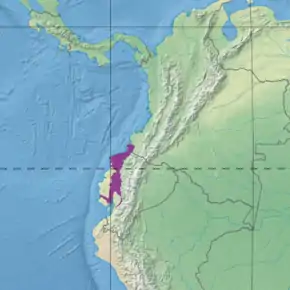 La ecorregión de los bosques húmedos del oeste de Ecuador abarca las tierras situadas al oeste de los Andes en Ecuador y el sur de Colombia. En el noroeste y el extremo suroeste la ecorregión se extiende hasta el Océano Pacífico.[1] La ecorregión está limitada al norte por el río Patía. Se extiende por las provincias de Esmeraldas, Manabí y Guayas, alcanzando el Golfo de Guayaquil en el sur, y las estribaciones de los Andes en el este. Su anchura varía entre 100 y 200 kilómetros. Tiene una superficie de 34.108 kilómetros cuadrados.[2]