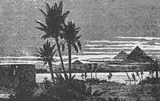 El centro de la composición son tres palmeras de color verde que descienden en tamaño, detrás de la última palmera, la más pequeña se alza un triángulo escaleno obtusángulo de color magenta, que se supone es una pirámide. Las palmeras están sobre un fondo claro, que se supone es la arena de un desierto, pero tiene arena de color claro, como si de una playa se tratase. Finalmente se ve en la parte inferior lo que se supone es un papel quemado, pues se ven las manchas y los pedazos faltantes que tendría una hoja expuesta al fuego.
